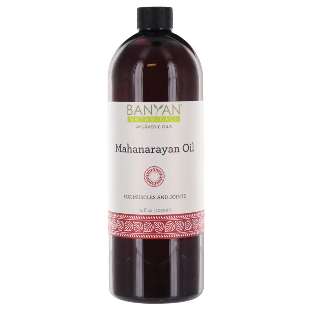 - The Mahanarayan Oil is based on an ancient Ayurvedic recipe that distributes powerful muscle and joint targeting herbs in a base of certified organic sesame oil. A nourishing and strengthening oil with rejuvenating qualities, it is used by gently massaging into sore muscles and tendons to bring warmth to the area. The synergistic blend of herbs supports the rejuvenation of joints. Mahanarayan Oil is great for supporting an active lifestyle, for those experiencing high vata, and promoting the natural rejuvenation process. The oil can be applied locally to areas where there is physical discomfort. It may also be diluted with a base oil and used in deep-tissue massage. Certified Organic.