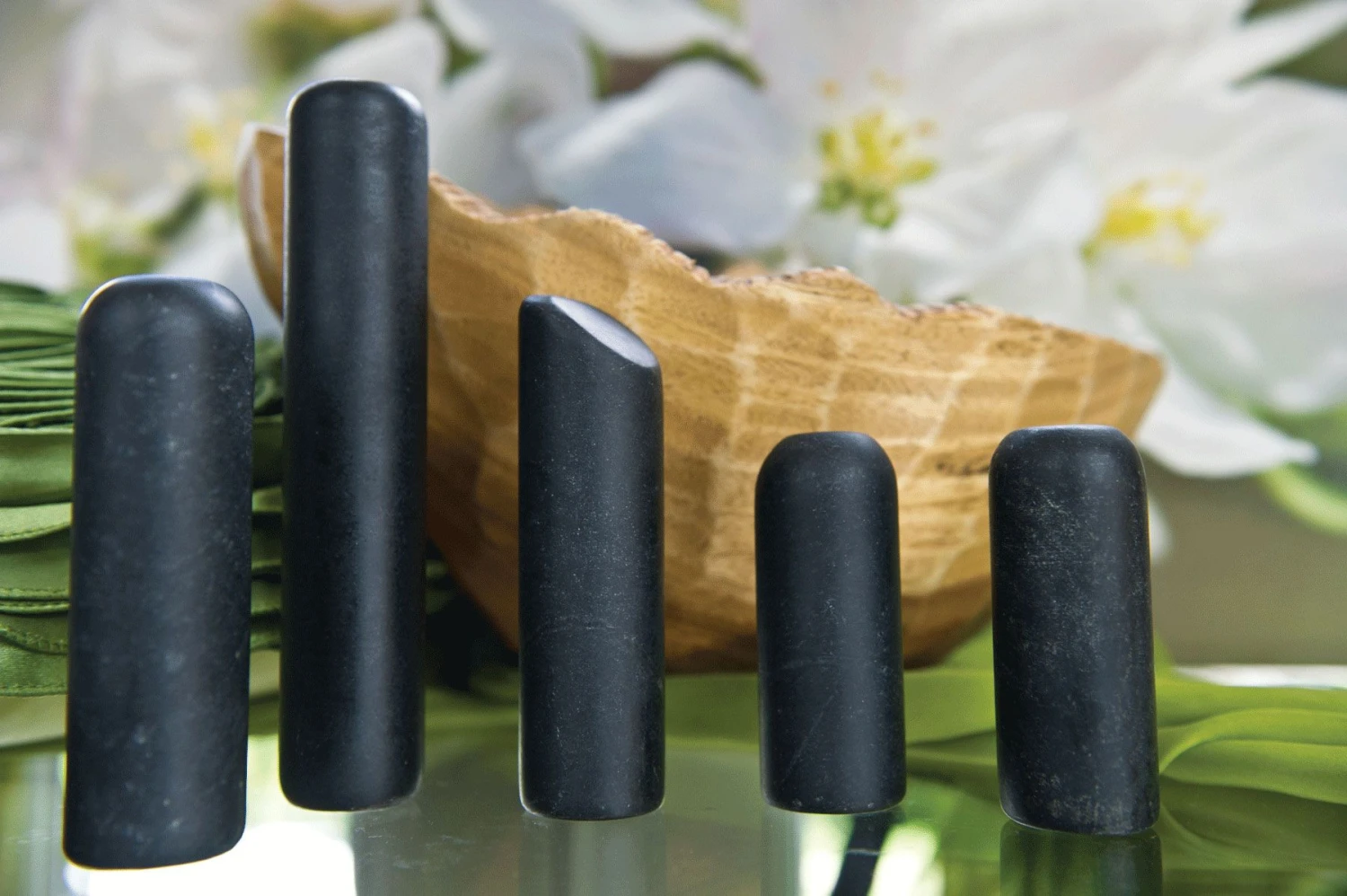 The 7″ stones are primarily used for the legs – front and back, hips, and upper back. The length of the stone is used for longitudinal stroking and compression. The end is used for pressure point release. The 5″ stone is primarily used for the back, arms, legs, and psoas. It has four usable surfaces; the length is for longitudinal stroking and compression, the flat end if used for pressure point release, the rounded end is used to work around bony landmarks and the angled end is used for cross-fiber friction, deep specific work, and working under the scapula. The 3 1/2″ stones are primarily used for the neck, arms, and abdomen. The 2 1/2″ stone is used for facial massage, reflexology, and deep specific work.