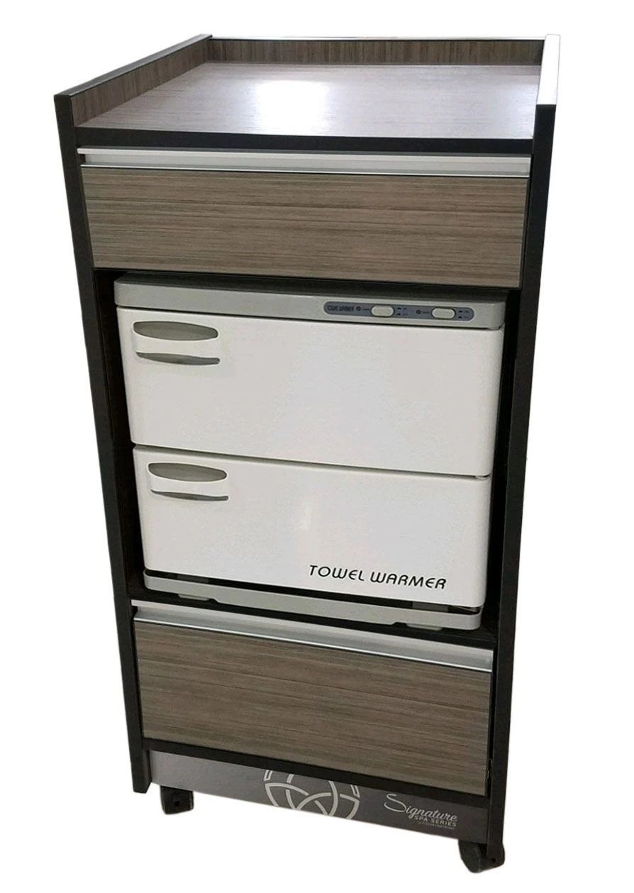 The Signature Spa Series Trolley Cart offers an attractive storage for your towel warmers, towels, and other treatment essentials. The trolley cart is available in laminate and wood. Customize your wood cart by adding a custom stain color. Cart comes standard with open storage, a 2” hole with grommet for cords, and 2” locking swivel casters.