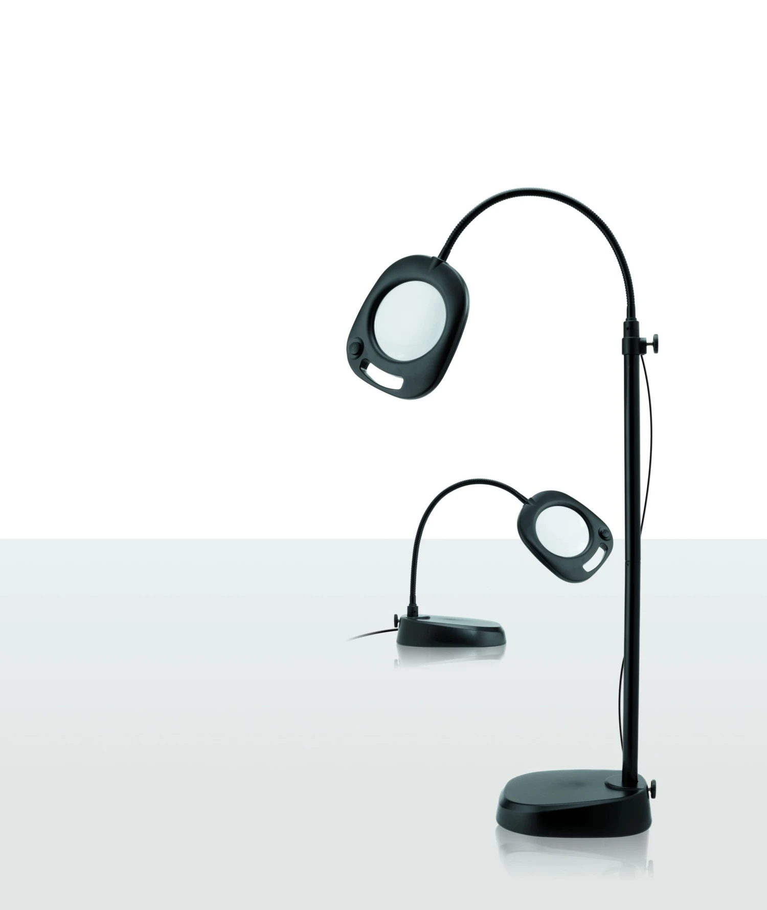 Practical and versatile floor lamp is ideal for estheticians and low vision users. 21 high performance, energy efficient Naturalight™ LEDs. 5″ lens (2.0X magnification) lets you see the most minute details. Flexible gooseneck aims light exactly where needed.Remove the pole to use the lamp on a table.