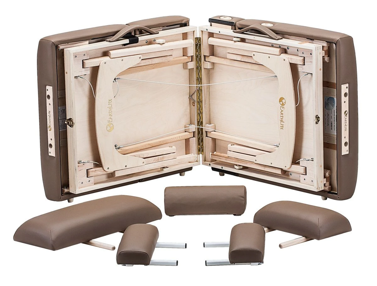Portable so you can take salon treatments — facials, reflexology, and more — to your clients! The multi-section salon tabletop with upper-body and leg tilts and thick, dense foam ensure your clients will be able to relax in comfort. And, treatment work is more comfortable for you as it is easy to position the client at your ideal working height. Like many stationary spa tables, the Calistoga Portable massage table can also be laid flat for massage. Constructed with the patented Cradle-lock Cable System with its recessed cables and struts ensures there is plenty of leg and knee room and it enables fast setup and takedown.