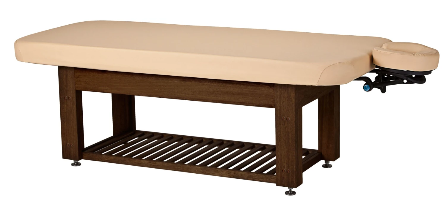 The Napa La Mer™ is the perfect solution for wet treatments, massage, Vichy showers, body wraps, mud masques, scrub treatments, and more. This beautiful shelf table is crafted with treated water resistant Teak wood and marine grade foam and Aqua™ vinyl. Add stainless steel hardware and a vented HDPE top and you have a table ready to endure the constant rigors of a wet room environment. Non-electric height adjustments are easy and can be done while the client is on the table. Just a few revolutions of the handle and the Napa La Mer positions itself perfectly for a number of wet room treatments as well as massage. Unlike other wet room tables, the comfortable upholstered top is designed to drain and can be removed for periodic disinfecting. At the end of their useful life, the foam and upholstery can easily be replaced.