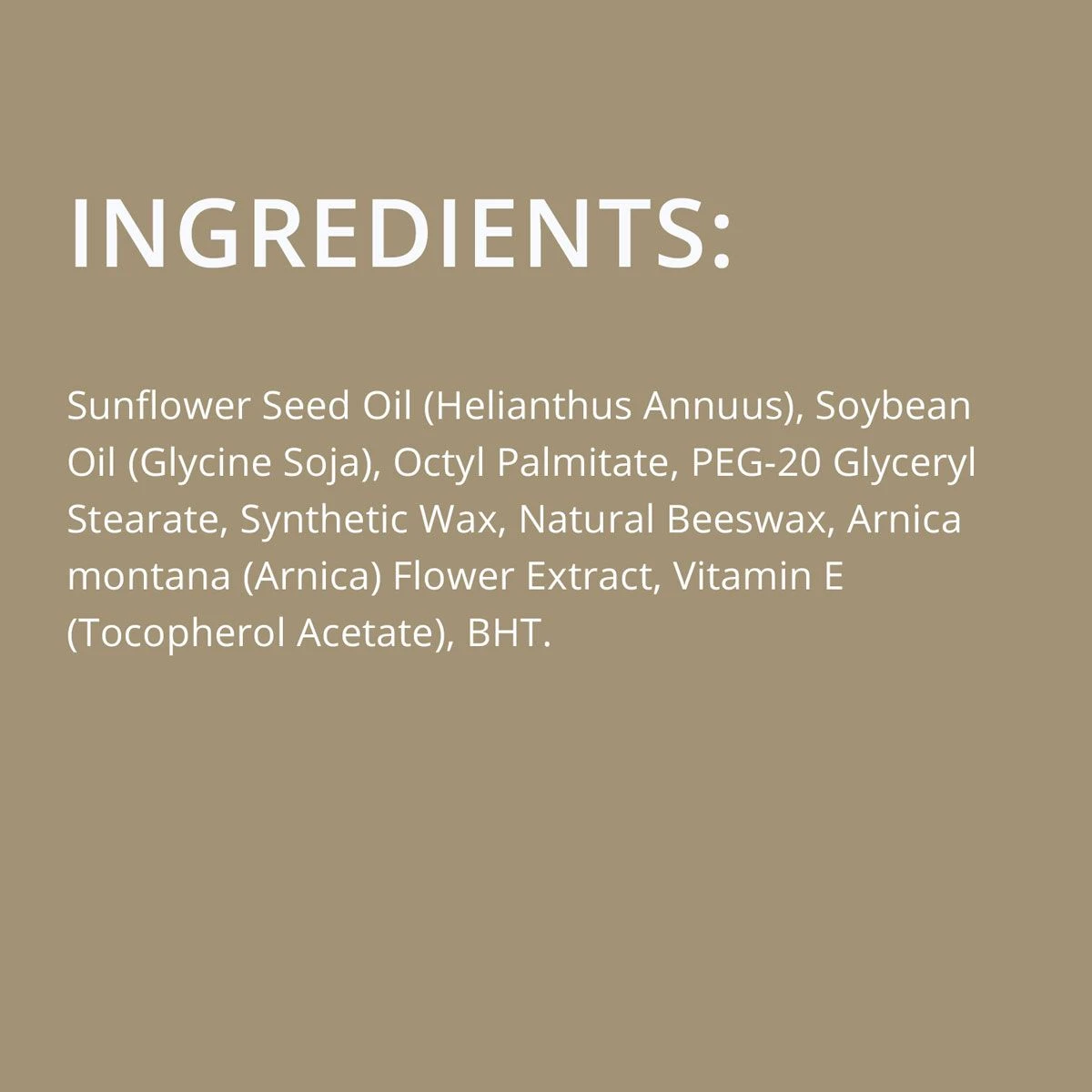 Sunflower Seed Oil (Helianthus Annuus), Soybean Oil (Glycine Soja), Octyl Palmitate, PEG-20 Glyceryl Stearate, Synthetic Wax, Natural Beeswax, Arnica montana (Arnica) Flower Extract, Vitamin E (Tocopherol Acetate), BHT