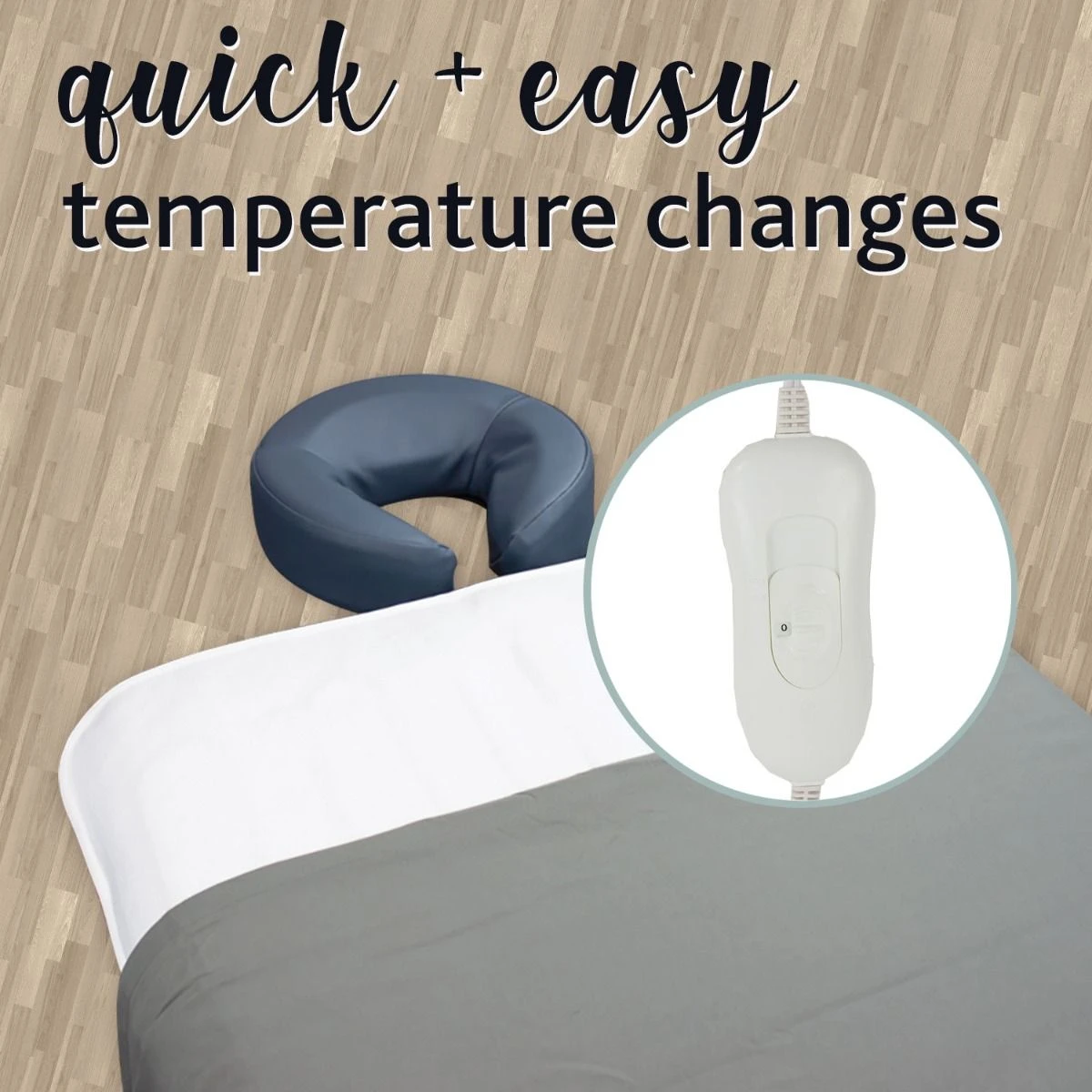 This analog massage table warmer is a great addition to your portable or stationary massage table. This full-sized table warmer provides even warmth from one end of the massage table to the other. You’re adding an inch of luxurious cushion to your table. The space created by the pad allows air trapped between your client and the table to keep clients comfortable cool in summer and warm in winter. Elastic bands secure the warmer to your tabletop while the user-friendly, analog controller allows for quick and easy temperature changes. The table warmer is 100% Polyester(450gsm). This is not hospital grade. 30” W x 72” L.