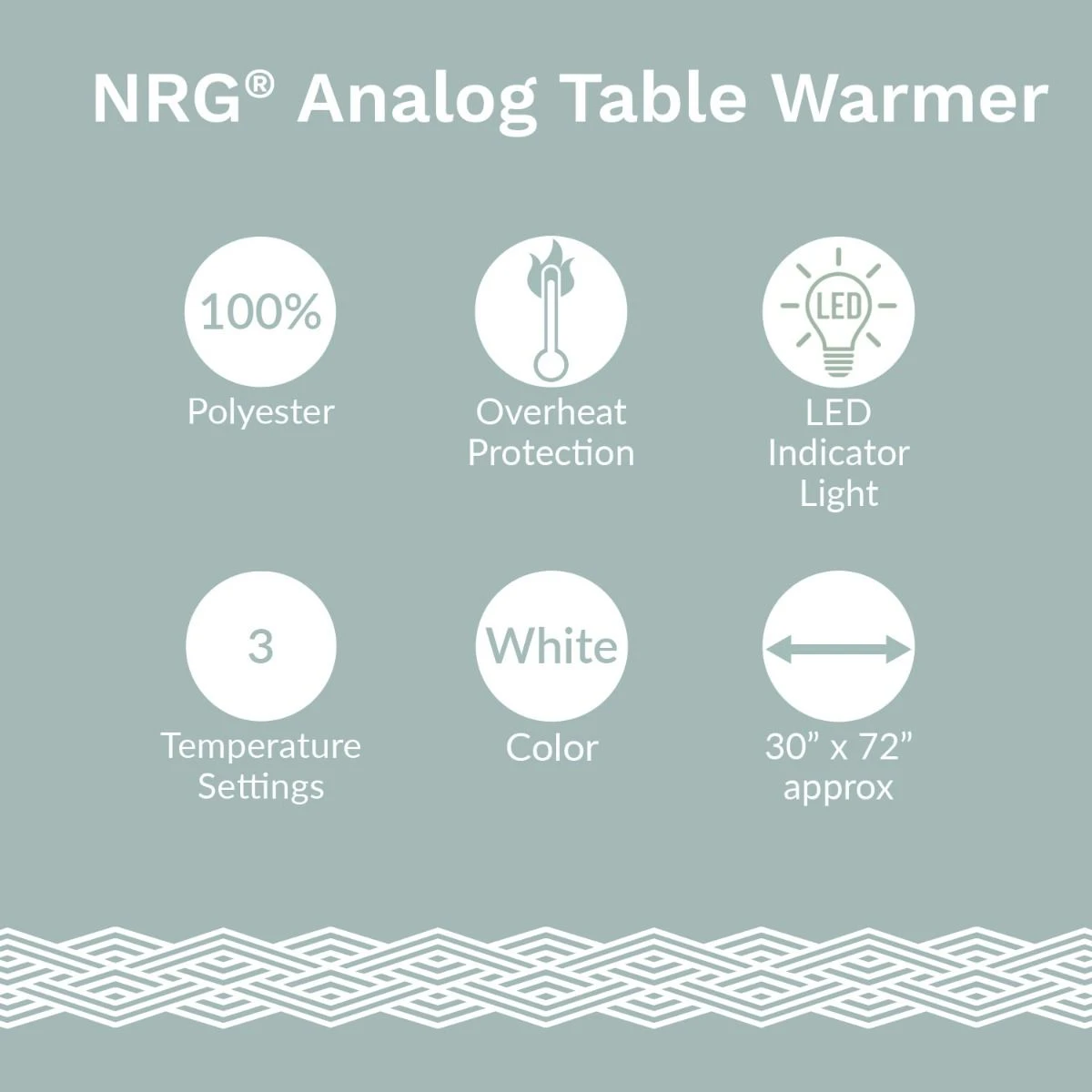 The table warmer is 100% Polyester (450gsm). 30” W x 72” L.
