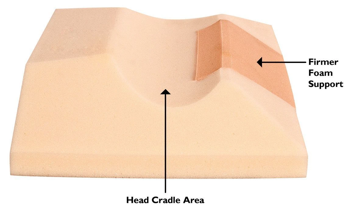 - Head easily rotates to the opposite side of the injection with comfortable support of the ear and occiput. The dual resistive foam is designed to resist roll back.