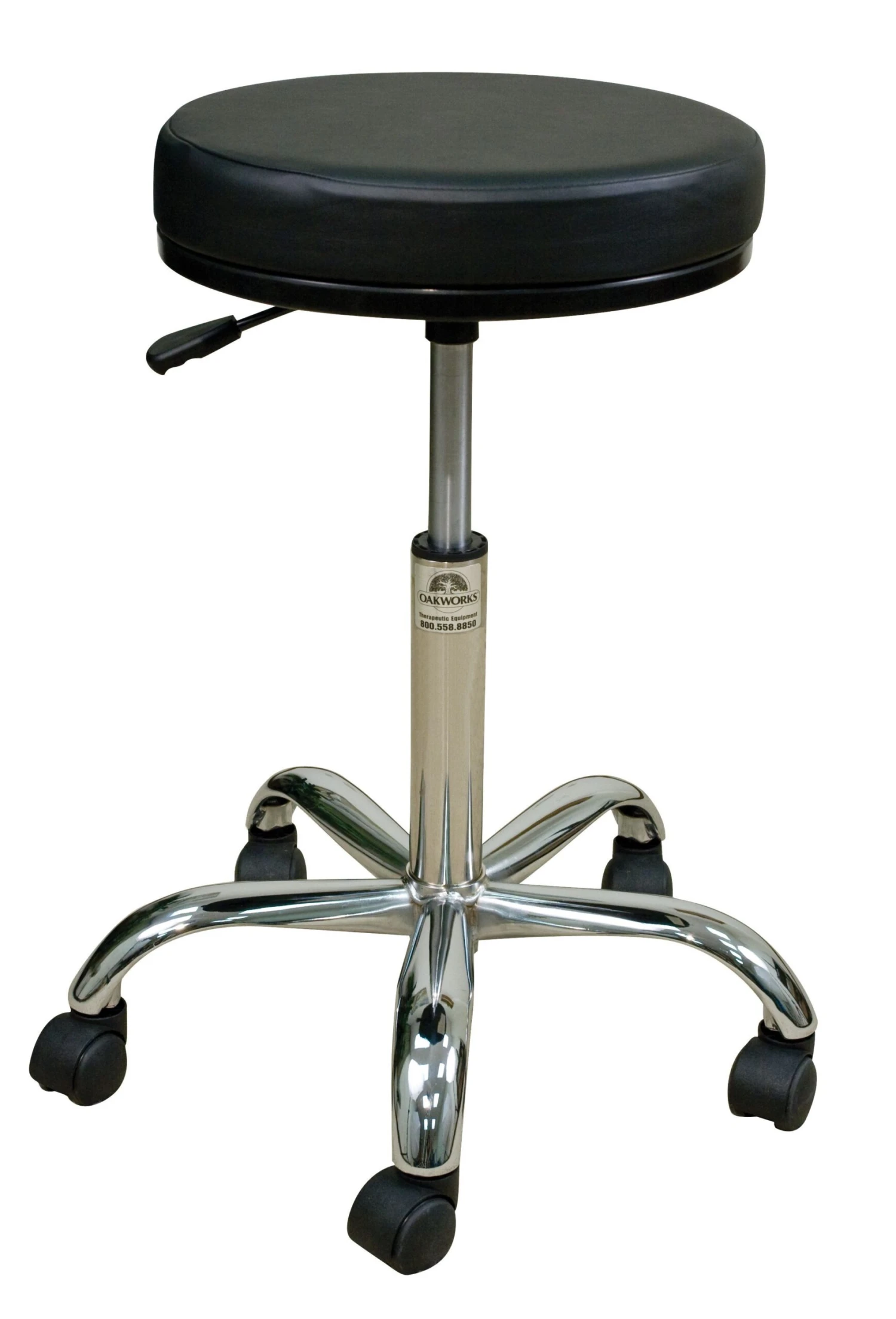 The Professional stool features a chromed steel, 5 star base with durable casters for easy movement. Simple pneumatic height adjustments are easily controlled with a hand lever.
