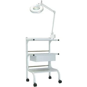 Heavy duty, powder-coated metal frame with shelving and one drawer for storage. Magnifying lamp fittings accommodate any Paragon® brand lamp (Magnifying Lamp pictured is not included). Includes UL listed four-outlet surge protector power strip. Assembly required.