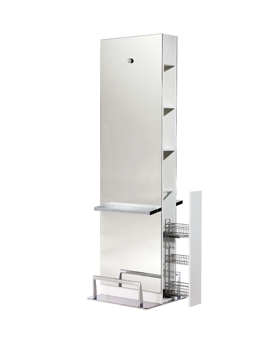 Tower Double island unit – matte white laminate structure, shelf available in stainless steel, pral or wooden finishing, with dryer holder – polished aluminium footrests with 2 side storage units.
