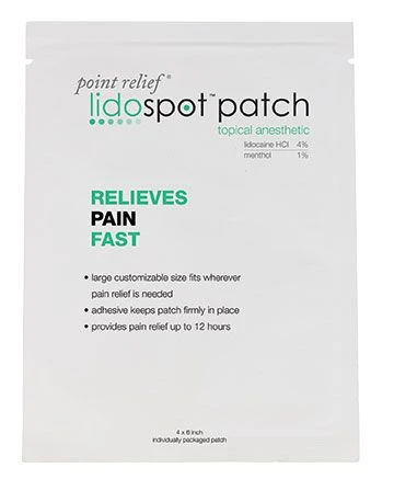 LidoSpot™ pain relieving patches provide long lasting pain relief. Each patch contains the highest amount of lidocaine (4%) permitted without a prescription along with 1% menthol. The patch is large enough to fit areas such as the lower back and can be cut to fit small, hard to fit areas such as the heel or elbow. Use a LidoSpot® patch as part of a pain treatment regimen to provide relief for up to 12 hours.