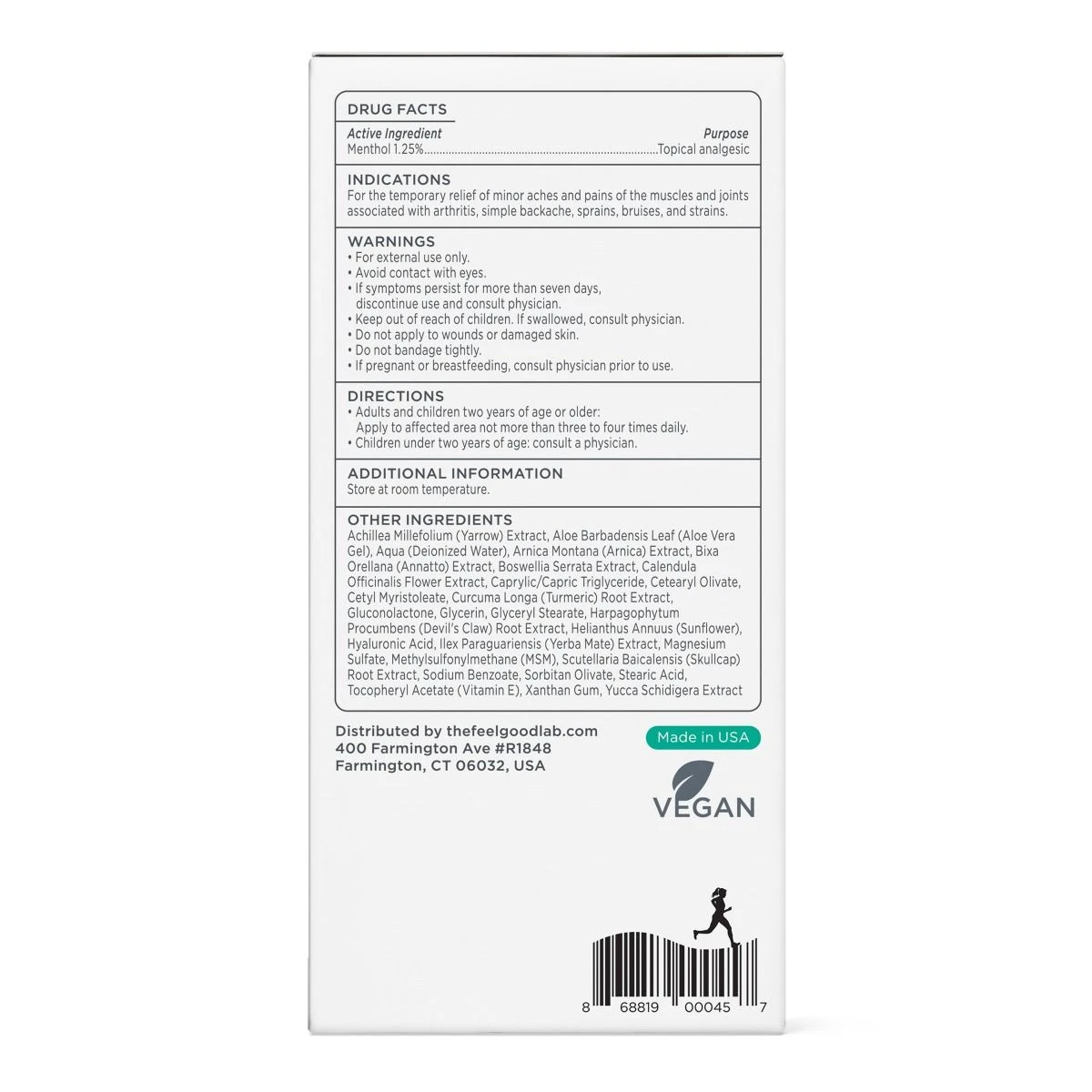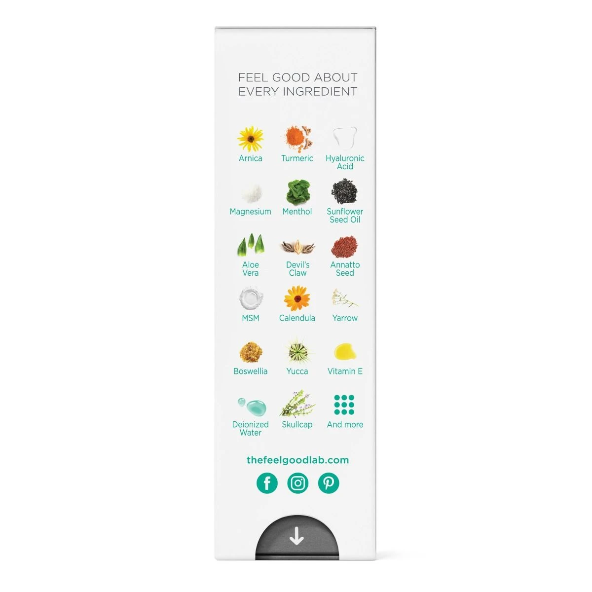 Menthol, Achillea Millefolium (Yarrow) Extract, Aloe Barbadensis Leaf (Aloe Vera Gel) Juice, Annatto Extract, Aqua (Deionized Water), Arnica Montana Flower Extract, Boswellia Serrata Extract, Calendula Officinalis Extract, Caprylic/Capric Triglyceride, Cetearyl Olivate, Cetyl Myristoleate, Curcuma Longa (Turmeric) Extract, Gluconolactone, Glycerin, Glyceryl Stearate, Harpagophytum Procumbens (Devil’s Claw) Extract, Hyaluronic Acid, Ilex Paraguariensis (Yerba Mate) Extract, Magnesium Sulfate, Methylsulfonylmethane (MSM), Scutellaria Baicalensis (Skullcap) Extract, Sodium Benzoate, Sorbitan Olivate, Stearic Acid, Tocopheryl Acetate (Vitamin E), Xanthan Gum, Yucca Extract.