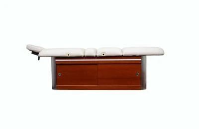 TouchAmerica’s Embrace treatment table lives up to its name. Ingenious drop-down, swing-away armrests adjust to support a wide range of body types. This is the best table on the market for rotator cuff and scapula work. Large 33.5” x 81” super-comfortable top accommodates everyone. Dual-pedestal lift motors allow top to tilt in either direction. A Bluetooth hand control operates the back, leg, and 26” – 34” height adjustments. Optional slotted cabinet has a white maple finish. Optional Small Hot Towel Cabi can be added at the foot section of the cabinet.